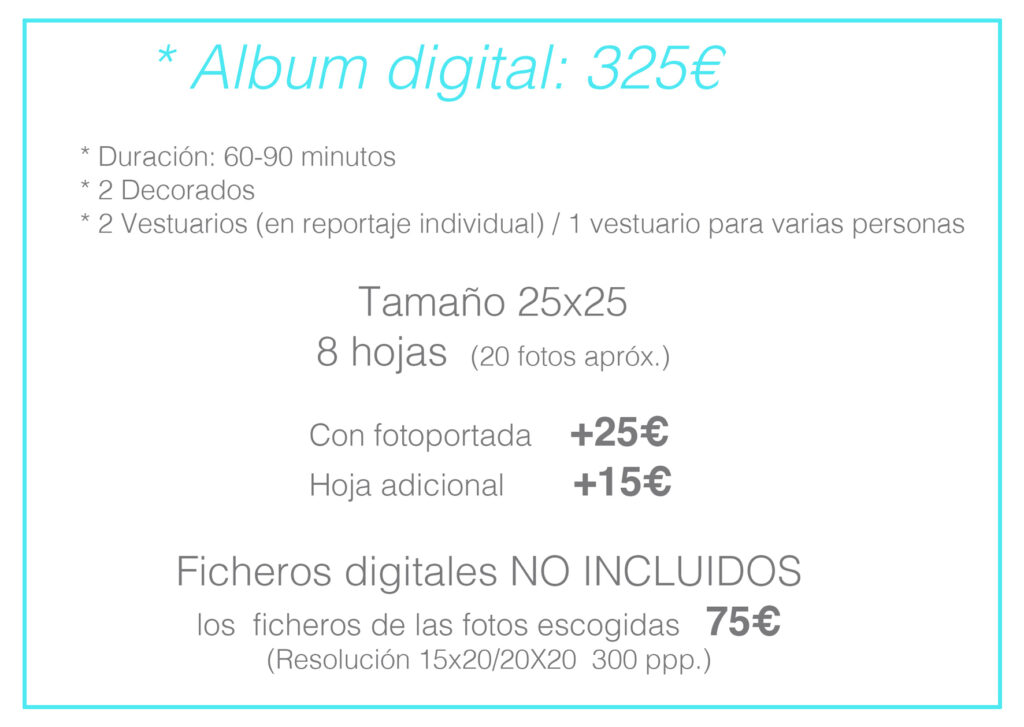 Esta sesión es perfecta para quienes prefieren conservar sus recuerdos en formato digital de alta calidad. Con una duración también de entre 60 y 90 minutos, se realiza en dos decorados e incluye dos cambios de vestuario (individual) o uno en caso de varias personas. El reportaje se entrega en un elegante álbum digital de 25×25 cm con 8 hojas (unas 20 fotos). Se puede añadir una fototapa por 25€, y cada hoja extra tiene un coste de 15€. Al igual que en las sesiones anteriores, los archivos digitales no están incluidos pero pueden adquirirse por 75€, con resolución óptima para impresión (15×20 o 20×20 a 300 ppp).