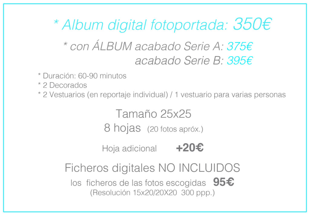 El reportaje se entrega en un elegante álbum digital con fotoportada de 25×25 cm, con 8 hojas (unas 20 fotos). Se pueden añadir hojas pagando un extra.